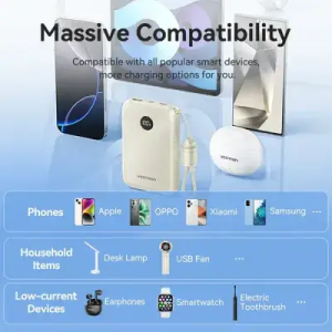 The VENTION FKAL0-C 10000mAh Power Bank is a powerful and travel-friendly solution for keeping your devices charged anytime, anywhere. With its high-capacity 10,000mAh battery, this VENTION FKAL0-C 10000mAh 22.5W Power Bank can easily provide multiple charges for smartphones, tablets, and other USB-powered devices, making it perfect for daily use and long trips. Designed for speed and efficiency, it features dual input ports (USB-C1 & USB-C2) that support fast recharging with a maximum input of 18W, allowing the power bank itself to be charged quickly. On the output side, it delivers up to 22.5W of fast charging through both USB-C and USB-A ports, supporting multiple fast-charge protocols including 5V-3A, 9V-2.22A, and 12V-1.67A, ensuring your devices charge safely and rapidly. A built-in USB-C cable adds ultimate convenience, eliminating the need for extra charging cords, while a clear LED digital display shows the remaining battery status at a glance. Crafted from premium PC+ABS materials in a sleek blue finish, the VENTION FKAL0-C Power Bank combines durability, style, and functionality. Its compact design makes it air-travel friendly, ideal for commuters, travelers, and anyone who needs a reliable fast-charging solution on the go. With advanced fast-charging technology, dual input ports, and a user-friendly design, the VENTION FKAL0-C 10000mAh Power Bank is one of the most versatile and convenient power banks.