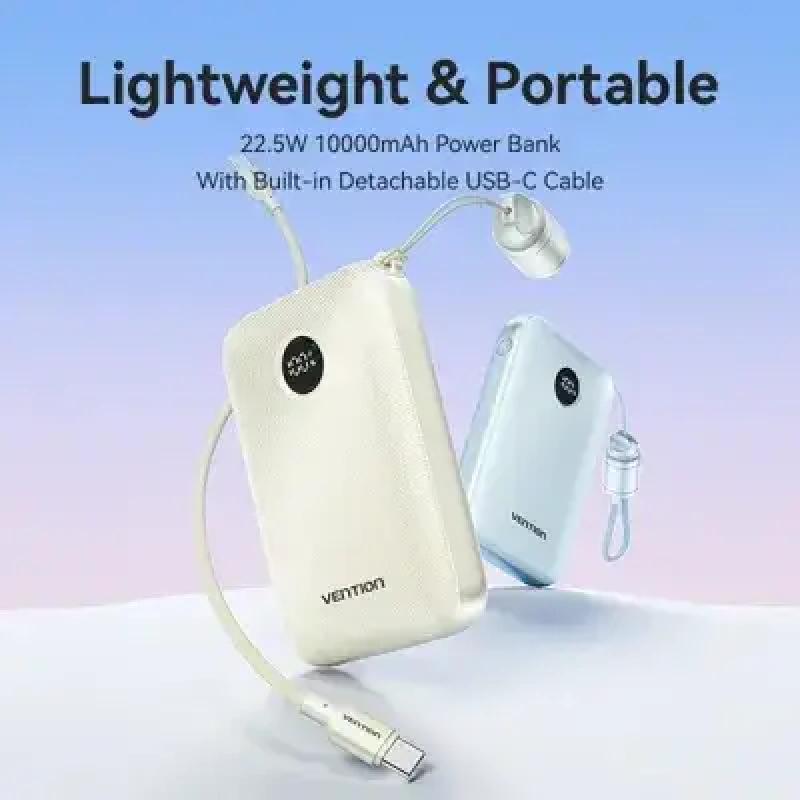 The VENTION FKAL0-C 10000mAh Power Bank is a powerful and travel-friendly solution for keeping your devices charged anytime, anywhere. With its high-capacity 10,000mAh battery, this VENTION FKAL0-C 10000mAh 22.5W Power Bank can easily provide multiple charges for smartphones, tablets, and other USB-powered devices, making it perfect for daily use and long trips. Designed for speed and efficiency, it features dual input ports (USB-C1 & USB-C2) that support fast recharging with a maximum input of 18W, allowing the power bank itself to be charged quickly. On the output side, it delivers up to 22.5W of fast charging through both USB-C and USB-A ports, supporting multiple fast-charge protocols including 5V-3A, 9V-2.22A, and 12V-1.67A, ensuring your devices charge safely and rapidly. A built-in USB-C cable adds ultimate convenience, eliminating the need for extra charging cords, while a clear LED digital display shows the remaining battery status at a glance. Crafted from premium PC+ABS materials in a sleek blue finish, the VENTION FKAL0-C Power Bank combines durability, style, and functionality. Its compact design makes it air-travel friendly, ideal for commuters, travelers, and anyone who needs a reliable fast-charging solution on the go. With advanced fast-charging technology, dual input ports, and a user-friendly design, the VENTION FKAL0-C 10000mAh Power Bank is one of the most versatile and convenient power banks.